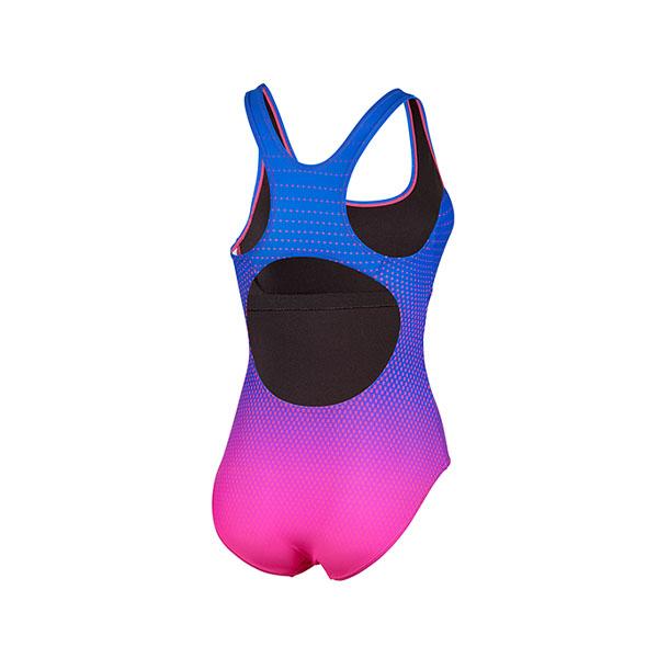 Met gradient dots zwemkleding in roze scoor je 1000 punten voor je sportieve zwemstijl! Het opvallend fel roze gekleurde design met roze gekleurde stippen en kleurverloop naar een meer donkere kleur blauw is totaal niet retro, maar ziet er enorm mooi en sportief uit! Het badpak is een Maxpower model en biedt een perfecte combinatie tussen bewegingsvrijheid en ondersteuning. Het badpak heeft een racerback achterkant met grote rugopening en medium hoge beensnit. Het badpak is aan de voorkant gevoerd en voorzien van een borstsupportband en uitneembare pads. Het badpak is verder uitgevoerd met brede schouderbandjes.